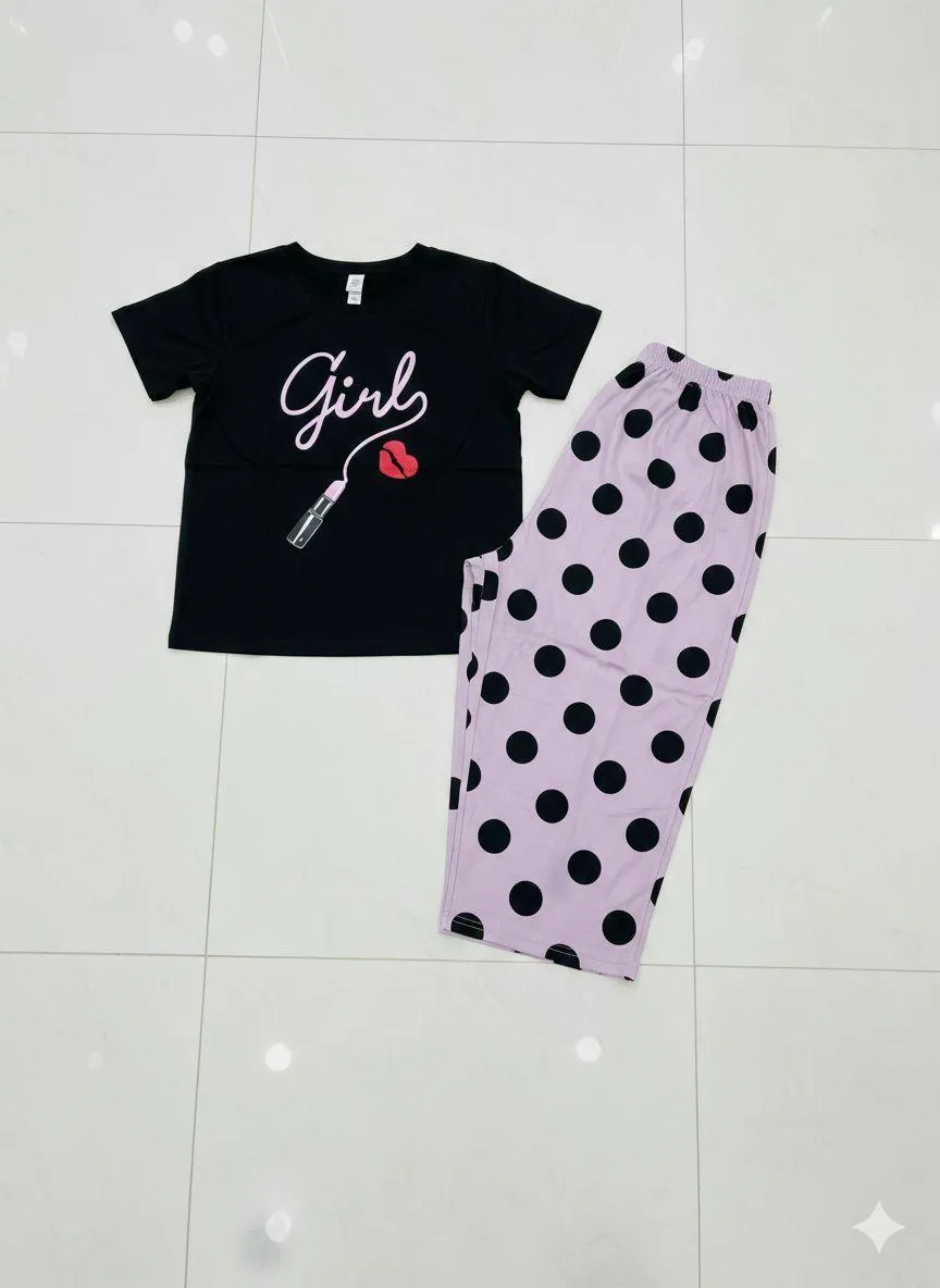 Looking for a comfortable night suit that’s both stylish and durable? This premium quality 2-piece set is perfect for Pakistani homes, offering cozy comfort for daily wear or special occasions. The soft jersey fabric ensures breathability and ease, making it ideal for local weather conditions. Designed with a trendy printed graphic on the shirt and a chic polka dot pattern on the trousers, this set adds a touch of elegance to your loungewear collection. The round neck design and relaxed fit provide maximum comfort without compromising on style. This night suit is crafted with durable materials that resist pilling and maintain their shape even after multiple washes. The printed design is vibrant and long-lasting, thanks to high-quality ink. The shirt’s 27-inch length and 23-inch chest measurement offer a flattering fit, while the trousers’ 39-inch length and 36-inch waist ensure a comfortable, roomy feel. The set is available in Medium, Large, and X-Large sizes, with precise measurements provided for a perfect fit. It’s a new arrival that combines affordability with premium quality, making it the best price in Pakistan for your sleepwear needs. – Premium quality jersey fabric for softness and durability – Stylish printed design on the shirt with a chic polka dot pattern on the trousers – Perfect fit with detailed size chart for Medium, Large, and X-Large – Ideal for daily wear, lounging, or light sleep – New arrival with best price in Pakistan – Durable stitching and vibrant print that lasts